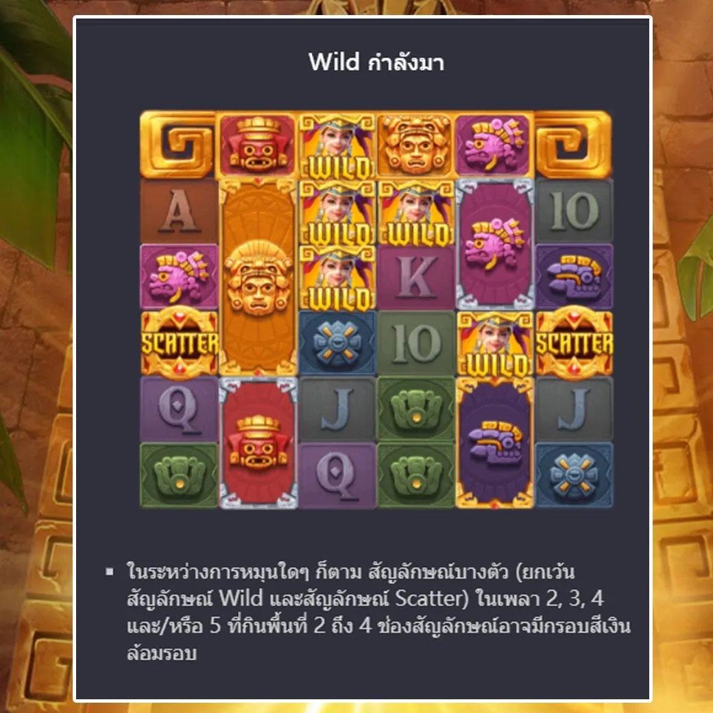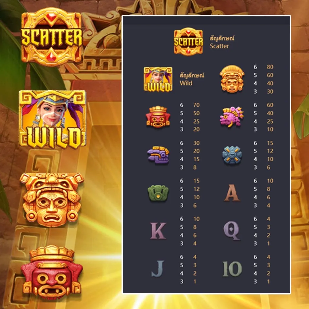สัญลักษณ์ ชาวมายันหน้ากากทองคำ ที่จะเป็นสัญลักษณ์ ที่ให้อัตราเงินรางวัลที่สุดจาก ทั้งหมด 11 สัญลักษณ์ ที่ไม่รวมเกี่ยวกับ Wild